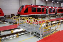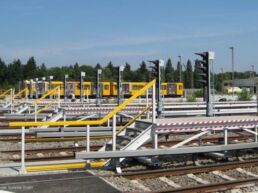 Moderne Abstellanlagen setzen zunehmend auf Ein- und Ausstiegspodeste aus GFK. Der Werkstoff bietet klare Vorteile: elektrische Isolierung, rutschfeste Oberflächen für ein sicheres Ein- und Aussteigen – auch bei Nässe – sowie eine nahezu instandhaltungsfreie Nutzung. Optional integrierte Handlauf-Beleuchtung erhöht zusätzlich die Orientierung und Sicherheit im Arbeitsbereich.