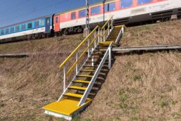 GFK-Treppen lassen sich schnell montieren, benötigen keine Erdung und verursachen nur minimale Instandhaltungskosten. Der Einbau kann ohne schweres Gerät erfolgen – dadurch sind geringe bis keine Sperrpausen erforderlich. Eine effiziente Lösung für sichere Zu uns Abgänge im Gleisbereich.