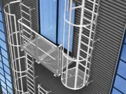 Klappbare Podeste für Steigleitern, ermöglichen Pausen bei langen Leitern gemäß DIN EN ISO 14122-4.